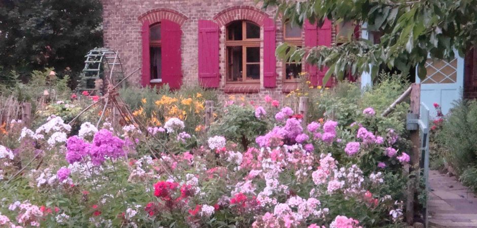 Der Küchengarten ist von Rosenhecken umsäumt. Von einer Streuobstwiese mit fünfzig Obstsorten kommen herrliche Früchte auf die Tafel.